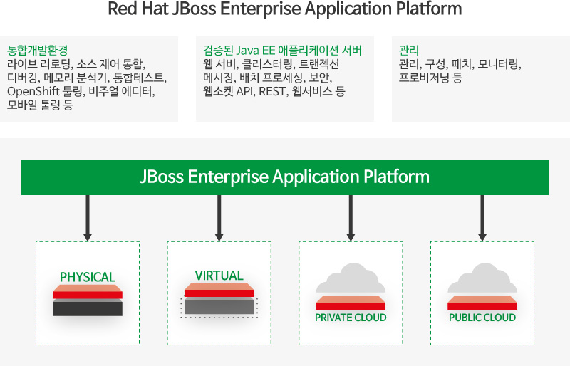JBoss EAP 아키텍처는 혁신적인 모듈식 클라우드 지원 플랫폼으로, 강력한 관리 및 자동화 기능을 통해 개발자의 생산성을 높여주는